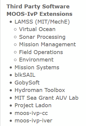 MOOS是一个包含有一些库函数的架构,他将多有应用独立化,以MOOSDB为中心,进行信息交流(目前我的理解,如有更新后续添加)。官网技术手册中介绍了一些公司或者研究机构基于MOOS基本函数库开发的应用。下面是目前的主要研究机构的扩展应用。