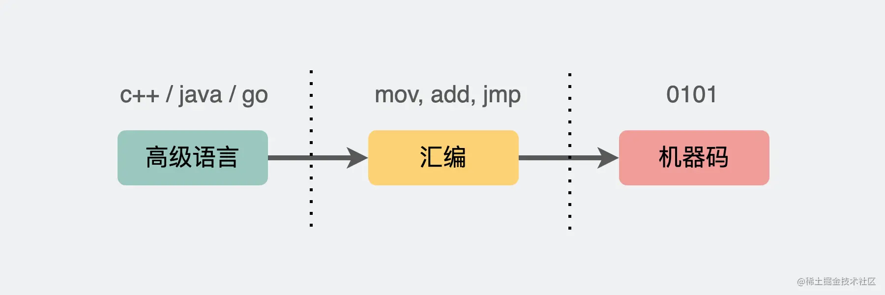 上面提到,我们平时写的代码(也就是C,go,java这些),先转成汇编,再转成机器码。最后CPU执行的是机器码,那么问题来了。