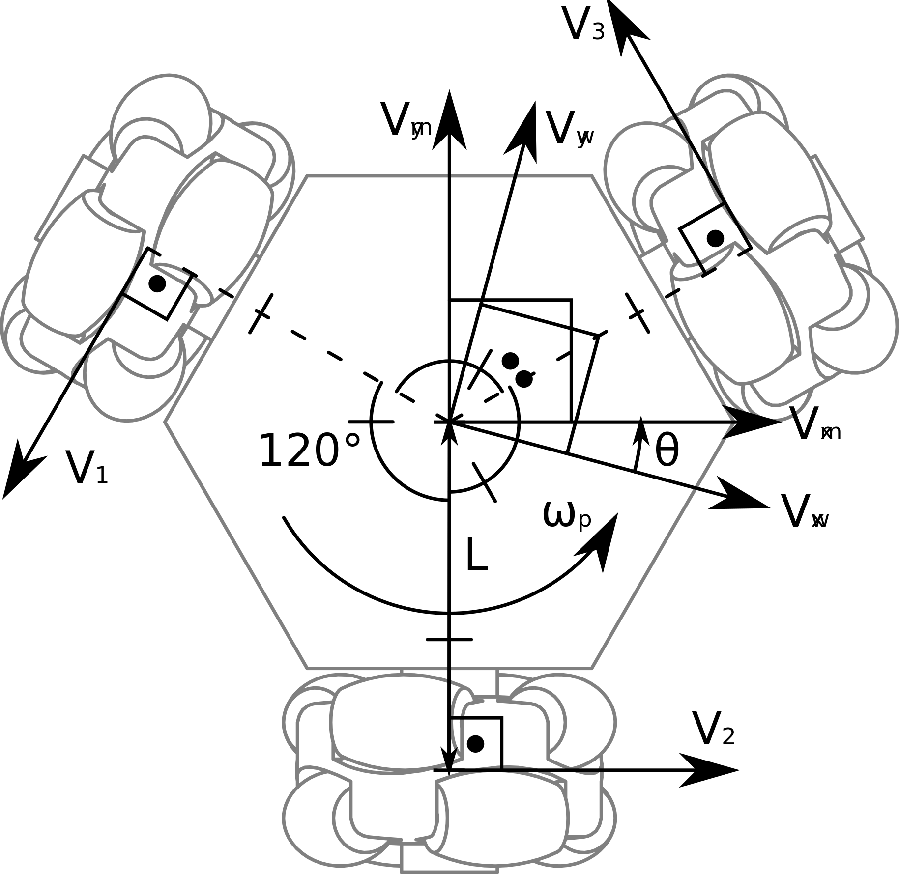 图中V1,V2和V3也分别称为V_left,V_back和V_right,对应三个轮子的转速,转动的正方向如图所示。