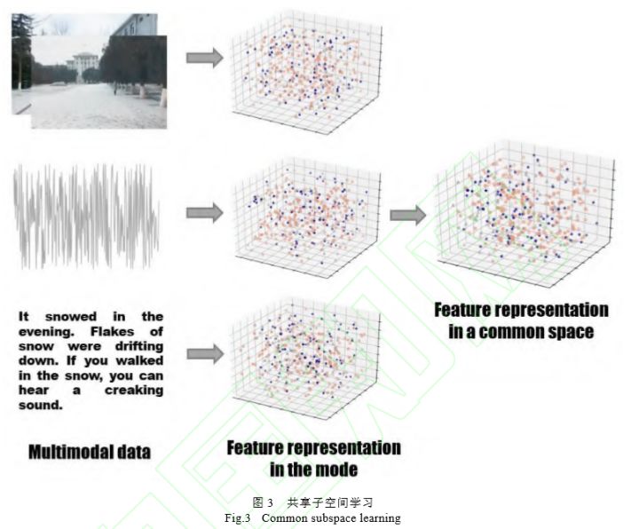 在高层语义空间中,多源数据具有较强的相关性。对于底层的特征表示,不同来源的数据往往具有较大差别。共享子空间学习对多源数据的相关关系进行挖掘,得到多模态特征的一致性表示,如图 3 所示。