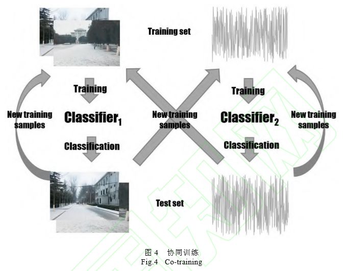 协同训练(Co-training)是一种典型的弱监督学习方法,该方法由 Blum 和 Mitchel 于 1998 年提出[52]。在多模态数据处理领域,它的大致思想是分别采用两个模态的有标签数据 X1、X2 训练两个分 类器,进而用这两个分类器对各自模态内的无标签数据进行处理。在此基础上,将分类结果中达到一 定置信度的样本作为训练集的补充,扩大训练集规模,进一步对分类器进行训练。在满足一定停止条件,如达到一定迭代代数后,将两个分类器的训练数据进行交换,即采用 X1模态中的数据对分类器 2 (Classifier2)进行训练,同时采用 X2中的数据对分类器 1(Classifier1)进行训练。协同训练的原理图 如图 4 所示。这种联合训练方法使分类器学习到不同数据源中尽可能多的知识,同时具备了较好的泛 化性能。协同训练假定数据集满足三个条件:1)数据之间相互独立;2)单一模态内的数据均能完整地对对象进行描述;3)存在充分的样本对分类器进行训练。然而在实际的应用场景中,往往很难满足上述的条件。研究者提出了多种改进手段以提升协同训练的性能。