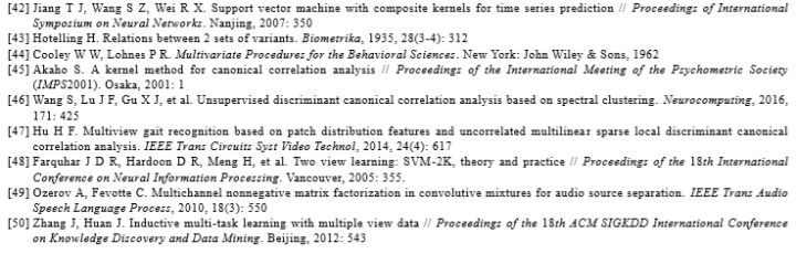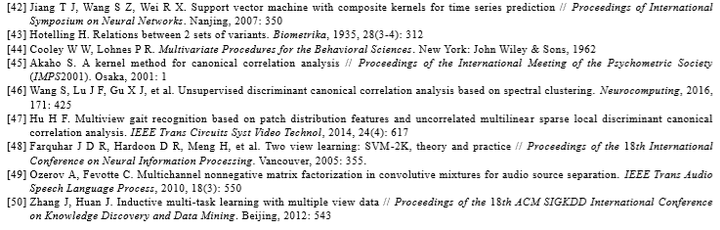 CCA 算法的本质是一种线性映射,采用 CCA 对复杂的非线性多模态信息进行拟合可能造成信息的损耗。在 CCA 的基础上,Akaho 提出了与核方法结合的非线性的 Kernel CCA 算法[45]。CCA 的其他改进形式还有判别典型相关分析(Discriminant canonical correlation analysis, DCCA)[46]、稀疏典型 相关分析(Sparse discriminant canonical correlation analysis, SCCA)等[47]。
