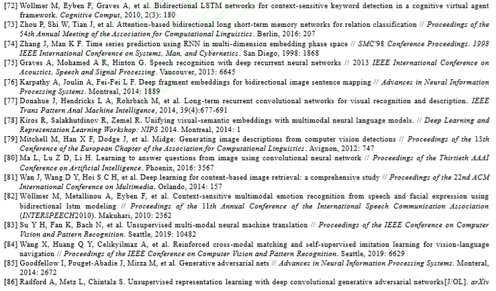 近年来,已有很多卓有成效的多模态深度学习方法被提出。如文献[76]在学习机制上进行改良, 即在对训练集进行学习时,不再构建图片-句子标签之间的映射关系,而是将图片中的对象和句子中 的实体匹配起来,首先对图片采取目标检测的任务,进而学习单词和细粒度图像区域之间的关系,在 此基础上生成标注句子。这一方式简化了对 Image-Caption 任务的训练集标注需求,即从句子简化为 单词。文献[77]结合 LSTM 的特性,构建了能够对多幅图像或视频内容进行理解和描述的深度神经网络框架,实现对视觉序列的文本描述。文献[78]设计了 CNN-LSTM 混合编码器对数据进行编码,进 而采用排序损失(Pairwise ranking loss)函数对数据进行训练。文献[79]借鉴了在基于 RNN 的机器翻译任务中的研究进展,用 CNN 替代 RNN 作为图片的编码器。在设计模型框架的同时,该文还提出了 得到相关细节描述的概率公式。文献[80]设计了基于图片的问答模型,该模型能够根据 CNN 编码的 图片和问题句子,生成正确的问题答案。文献[81]重点研究了采用 CNN 模型的基于内容的图片检索 问题,并分析了深度卷积神经网络对高维语义特征的有效表达能力。文献[82]则采用多模态深度学习 框架,通过构建多个 LSTM 结构处理情感分类问题。文献[83]提出一种多模态无监督机器翻译方法, 采用描述同一内容的图片链接跨语种语料,实现语义对应与融合。文献[84]采用强化学习的手段对文 本和视觉场景进行匹配,进而对自动驾驶决策进行推理。