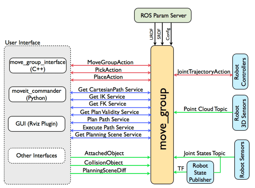 moveit的使用通过为用户提供接口来调用它,包括C++、Python、GUI三种接口。ROS中的move_group节点充当整合器,整合多个独立组件,提供ROS风格的Action和service。move_group通过ROS topic和action与机器人通讯,获取机器人的位置、节点等状态,获取数据再传递给机器人的控制器。