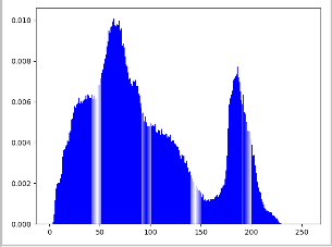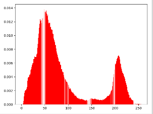 4.灰度直方图源码4.灰度直方图源码 # 1 0-255 2 概率 # 本质:统计每个像素灰度 出现的概率 0-255 p import cv2 import numpy as np import matplotlib.pyplot as plt img = cv2.imread('image0.jpg',1) imgInfo = img.shape height = imgInfo[0] width = imgInfo[1] gray = cv2.cvtColor(img,cv2.COLOR_BGR2GRAY) count = np.zeros(256,np.float) for i in range(0,height): for j in range(0,width): pixel = gray[i,j] index = int(pixel) count[index] = count[index]+1 for i in range(0,255): count[i] = count[i]/(height*width) x = np.linspace(0,255,256) y = count plt.bar(x,y,0.9,alpha=1,color='b') plt.show() cv2.waitKey(0)