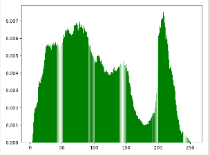 # 本质:统计每个像素灰度 出现的概率 0-255 p import cv2 import numpy as np import matplotlib.pyplot as plt img = cv2.imread('image0.jpg',1) imgInfo = img.shape height = imgInfo[0] width = imgInfo[1] count_b = np.zeros(256,np.float) count_g = np.zeros(256,np.float) count_r = np.zeros(256,np.float) for i in range(0,height): for j in range(0,width): (b,g,r) = img[i,j] index_b = int(b) index_g = int(g) index_r = int(r) count_b[index_b] = count_b[index_b]+1 count_g[index_g] = count_g[index_g]+1 count_r[index_r] = count_r[index_r]+1 for i in range(0,256): count_b[i] = count_b[i]/(height*width) count_g[i] = count_g[i]/(height*width) count_r[i] = count_r[i]/(height*width) x = np.linspace(0,255,256) y1 = count_b plt.figure() plt.bar(x,y1,0.9,alpha=1,color='b') y2 = count_g plt.figure() plt.bar(x,y2,0.9,alpha=1,color='g') y3 = count_r plt.figure() plt.bar(x,y3,0.9,alpha=1,color='r') plt.show() cv2.waitKey(0)