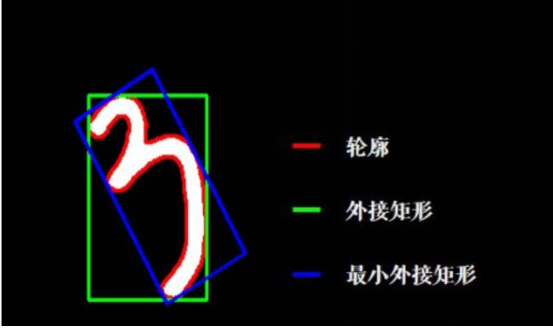 轮廓的外接矩形有两种,如下图,绿色的叫外接矩形boundingRect(),表示不考虑旋转并且能包含整个轮廓的矩形。蓝色的叫最小外接矩形minAreaRect(),考虑了旋转