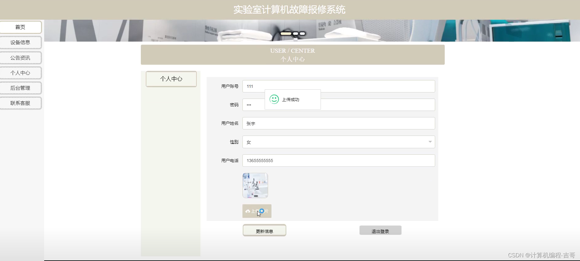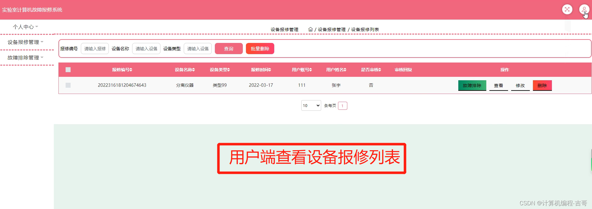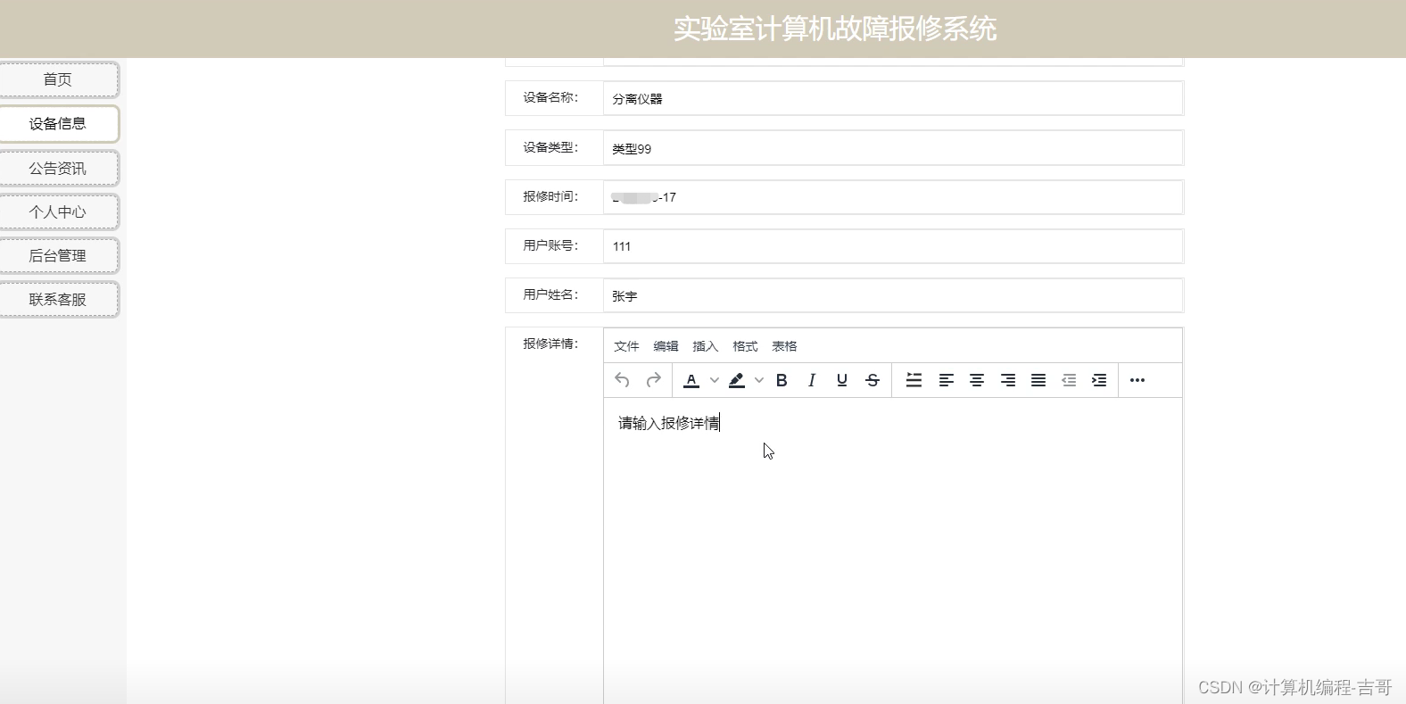 我是靠谱客的博主 无情小虾米,这篇文章主要介绍基于Java+SSM+JSP+MySQL实验室计算机报修系统的设计和实现【Java毕业设计·安装调试·代码讲解·文档报告】,现在分享给大家,希望可以做个参考。
