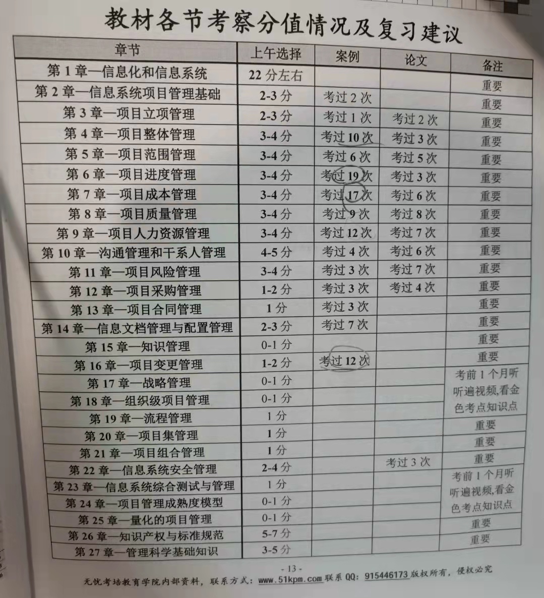 复习的教材除了官方出的九百多页的项目管理师教程,就是另一本同色的软考通关(考点精炼+专题冲刺,还有通过“海鲜市场”本地交易的(上半年)江山老师的无忧考培上半年培训班配套的各类二手复习材料,赠送号称两个月完成考证的复习培训班视频。