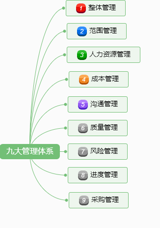 包含:整体管理,范围管理,人力资源管理,成本管理,沟通管理,质量管理,风险管理,进度管理和采购管理。