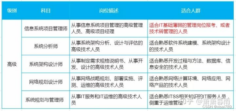 从事信息系统项目管理的高级管理人员、高级项目经理。适合IT基础薄弱的管理岗位报考、或者技术转管理的人员。