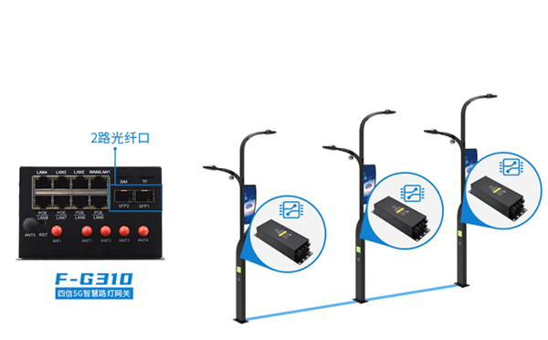 5G智慧路灯网关F-G310具有强大的设备接入能力、通信协议转换、运算处理能力;可对接智能照明、视频监控、交通指示、交通监控、环境、气象监测、信息发布、公共广播、公共WLAN、紧急求助、信息交互、充电服务等功能的设备,通过有线、光纤、4G、5G方式通信。
