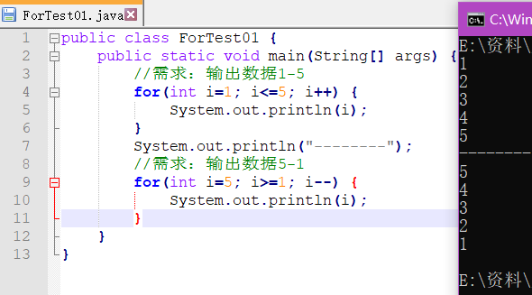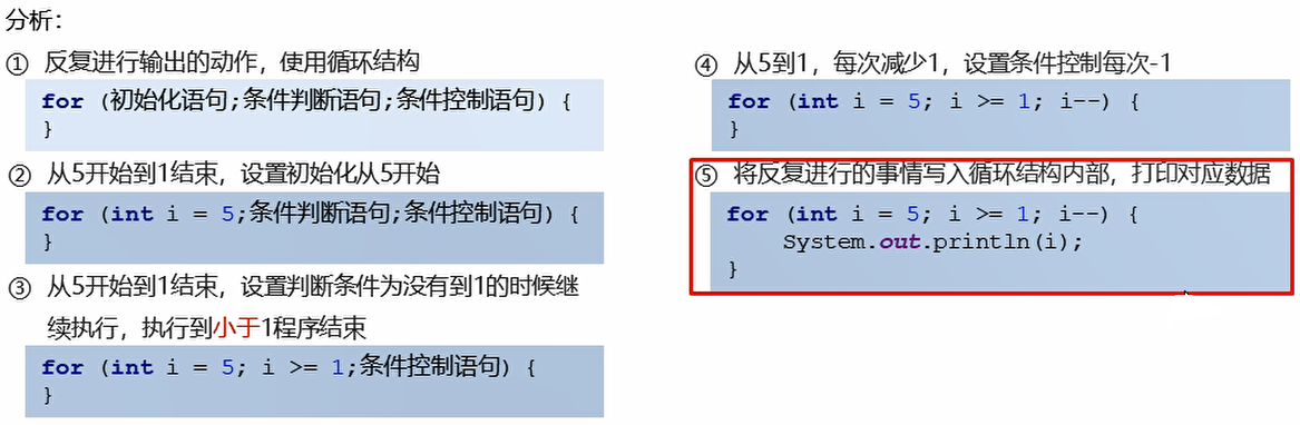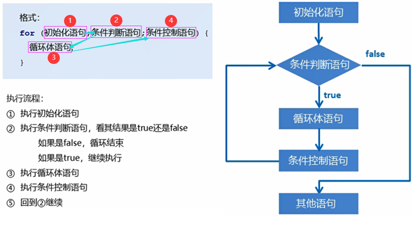 - 初始化语句: 用于表示循环开启时的起始状态,简单说就是循环开始的时候什么样。