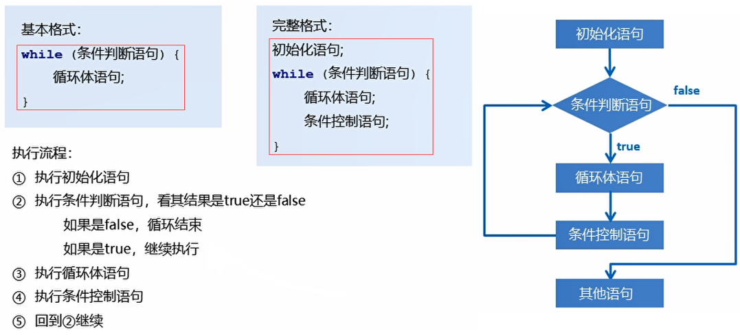 - 条件判断语句:用于表示循环反复执行的条件,简单说就是判断循环是否能一直执行下去。