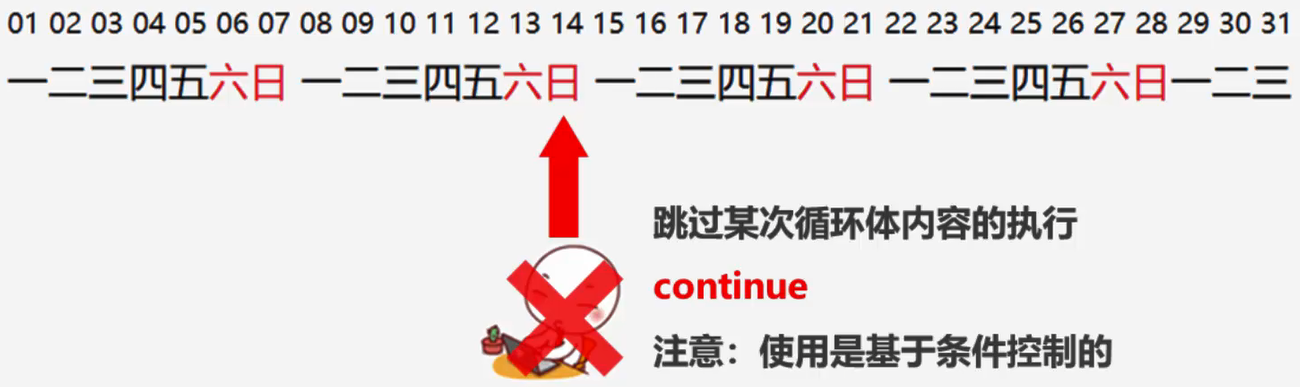 - 用在循环中,基于条件控制,跳过某次循环体内容的执行,继续下一次的执行。