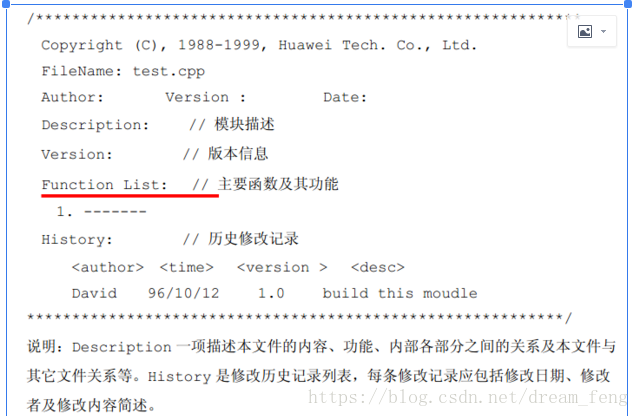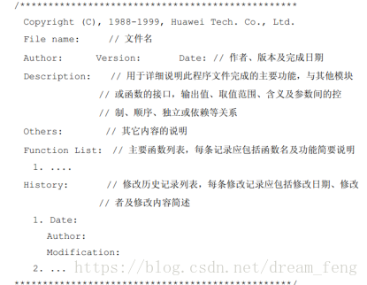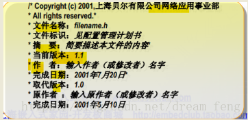 内容:版权、文件名,概要;版本号-作者-日期+代码更新信息,备注信息;