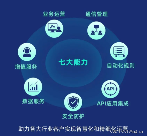 业务运营、通信管理、自动化规则、API应用集成、安全防护、数据服务、增值服务,七大能力助力各大行业客户实现智慧化和精细化运营。