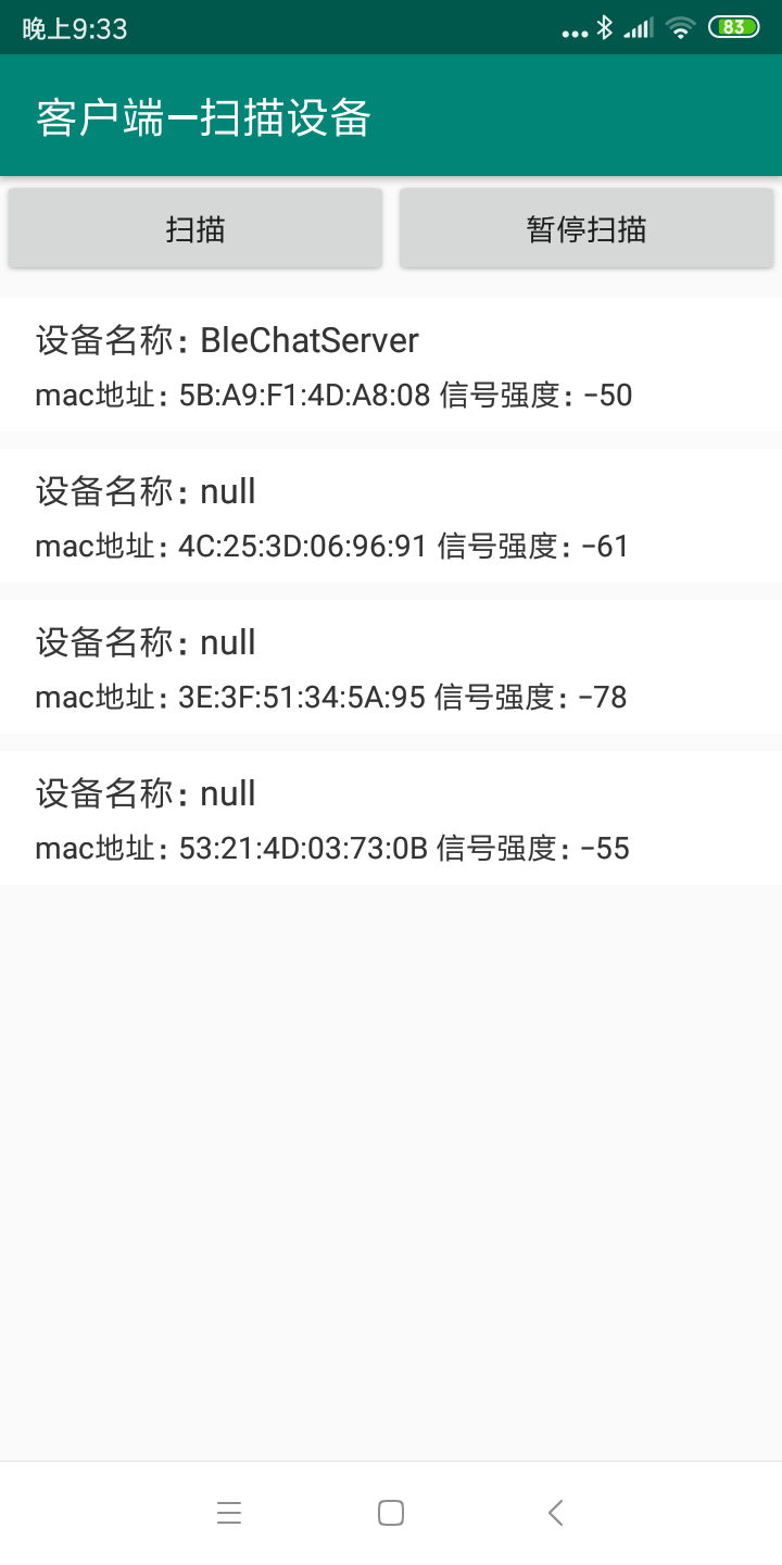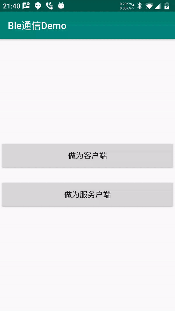 以上就是花痴黑裤最近收集整理的关于Android通过蓝牙(BLE低功耗蓝牙)实现设备间通讯 | 客户端 | 服务端的全部内容,更多相关Android通过蓝牙(BLE低功耗蓝牙)实现设备间通讯内容请搜索靠谱客的其他文章。