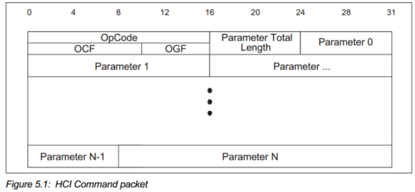 Opcode:每个命令被分配一个2字节的操作码(opcode),用来唯一地识别不同类型的命令,操作码(opcode)参数分为两个字段,称为操作码组字段(Opcode Group Field, OGF)和操作码命令字段(Opcode Command Field, OCF)。其中OGF占用高6bit字节,OCF占用低10bit字节。