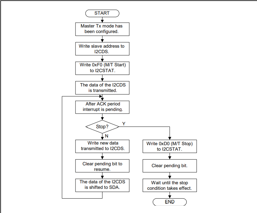 if Y线:向IICSTAT中写入0xD0(停止信号),清理中断挂起位,等待停止信号结束,此时整个通信结束