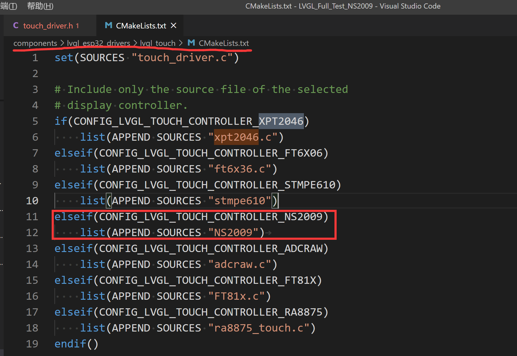 打开LVGL驱动触摸驱动目录中的CMake文件,componentslvgl_esp32_driverslvgl_touchCMakeLists.txt