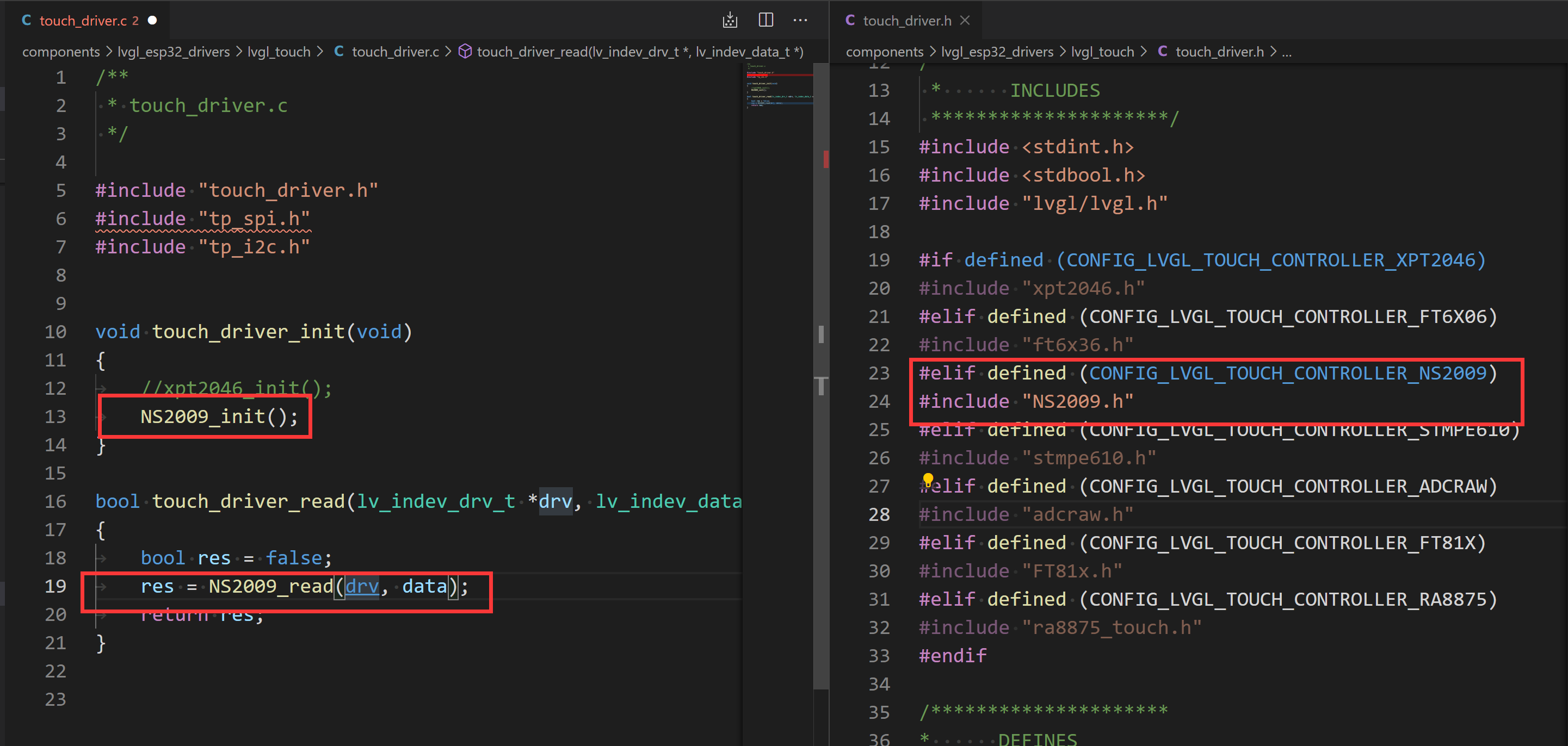 修改touch_driver.c 和.h文件。touch_driver.h文件添加NS2009配置定义包含头文件。touch_driver.c修改LVGL的触摸初始化和触摸读取的接口函数NS2009_init,NS2009_read(drv, data),在NS2009.C要实现这两个函数
