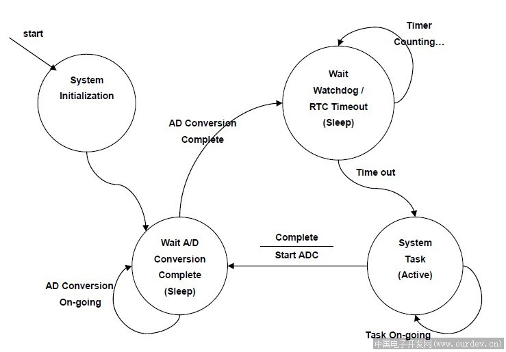 2)研究具体应用的需求,明确系统的工作模式(以采样类的模式来说就是采样,休息,再采样,再休息,整个系统是一个状态机并以采样事件作为驱动;采样不仅提供信息,也提供系统的脉搏。即便这类系统还涉及到LCD刷新或者I2C/串口通讯,由于信息的本源是采样,因此采样周期本身决定了信息的有效性,那么LCD的刷新周期,或者通讯的缓冲跟新周期没有理由必须大于采样的更新周期)。在这一前提下,明确系统对唤醒源以及唤醒模式的需求,由此便确定了系统的基础休眠模式,进一步说,比较这一基础休眠模式功耗和应用所需的功耗,便可给出系统设计的一个初步评估结果。有时候甚至能给出一些系统功耗的直接预期数据。