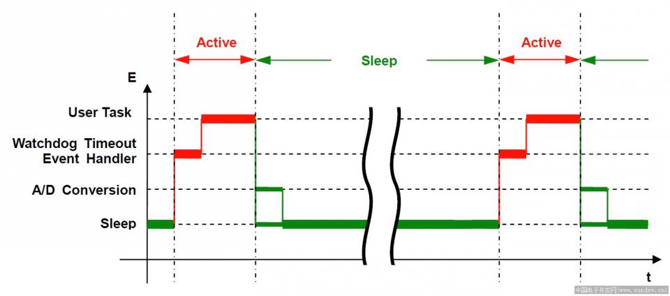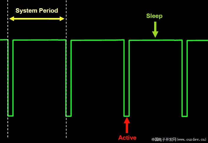 这里的普通工作模式是指能够实现正常系统功能的模式,在这种模式下,MCU并非一直处于工作状态,而是根据前面一章提到的功耗公式,结合了Active和Sleep两种MCU状态的模式。简而言之,一个保证了应用基本功能的同时能休眠就休眠的工作模式。