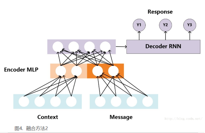 考虑到RNN对长度敏感的问题,文献3提出了针对聊天机器人场景优化的Encoder-Decoder模型,核心思想是将Encoder用多层前向神经网络来代替RNN模型,神经网络的输出代表上下文信息Context和当前输入Message的中间语义表示,而Decoder依据这个中间表示来生成对话Response。
