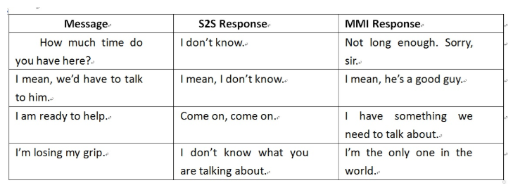 采用MMI作为目标函数明显解决了很多“安全回答”问题,下表是两个不同优化目标函数产生的应答Response的示例,其中Message列代表用户输入语句Message,S2S Response代表MLE优化目标产生的应答,MMI Response代表MMI优化目标产生的应答。