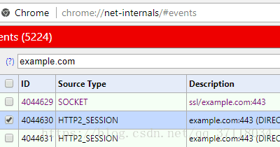 访问chrome://net-internals/#events(这链接没法点击,只能复制然后粘贴到地址栏再访问),在搜索框输入你的域名(我以example.com为例),然后在其他标签中打开出问题的网站。返回chrome://net-internals/#events ,选中Source Type 是HTTP2_SESSION 的行。
