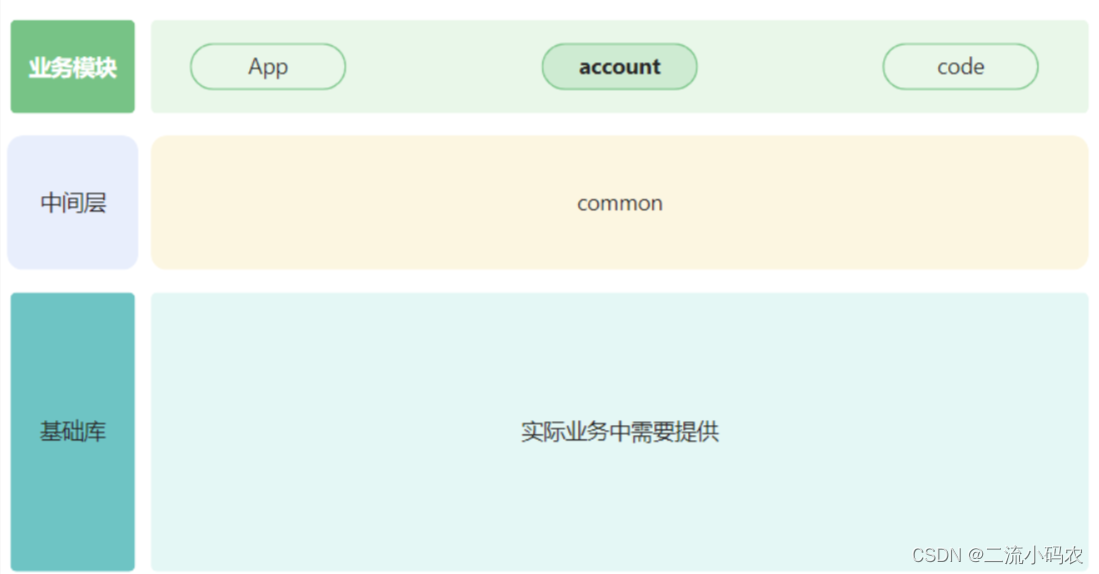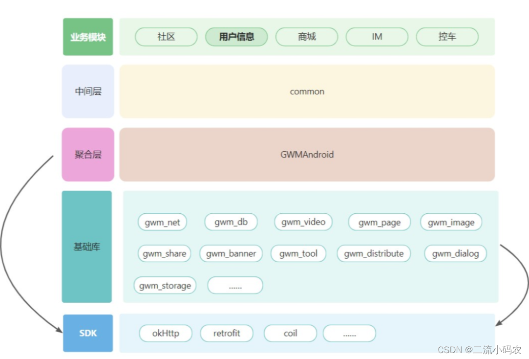 首先呢,基础的依赖是一层,这一层,包含了上层业务层所需要的必须实现,比如网络库,比如图片加载库,比如Dialog加载库,再比如一些常见的,工具类,数据操作等等,我们可以叫它为基础库,基础库的存在,除了提供必须的能力之外,更是对能力的封装,封装在于,给业务层提供方便的调用方式,更是为了可替换,也就是说,后续一旦升级或者更换其他的,直接在基础库中更改即可,业务层无需操作,大大减少耦合度,比如图片加载,一开始我们使用的是Glide,后边要调整为coil,只需要在基础库中更改即可。