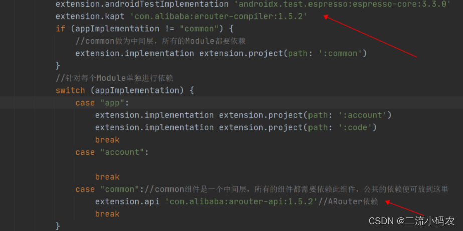 新建的项目中,我把account和code做为业务组件,两个组件是互不关联的,我们要实现的就是这两个组件之间的跳转,组件之间跳转使用的是阿里的ARouter,大家可以按照官网进行一步步依赖,我在第2步中已经依赖进去,最新的版本,如下所示: