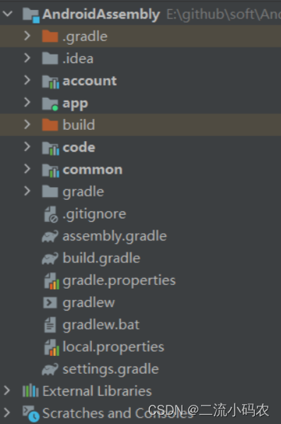 我这里首先创建一个项目,毕竟不是实际业务,目前就先创建四个模块,app是主模块,common是中间层,account和code是组件,也就是实际的业务模块,如下图。