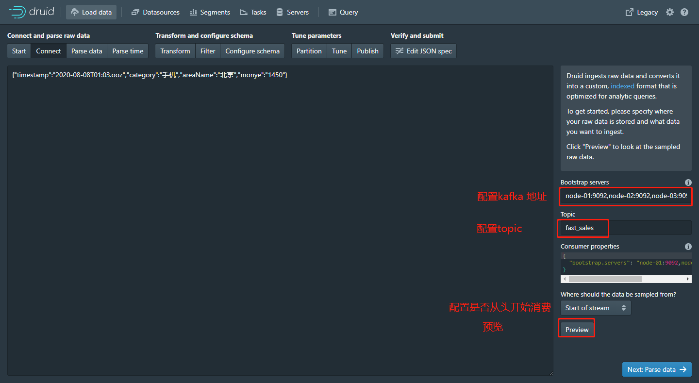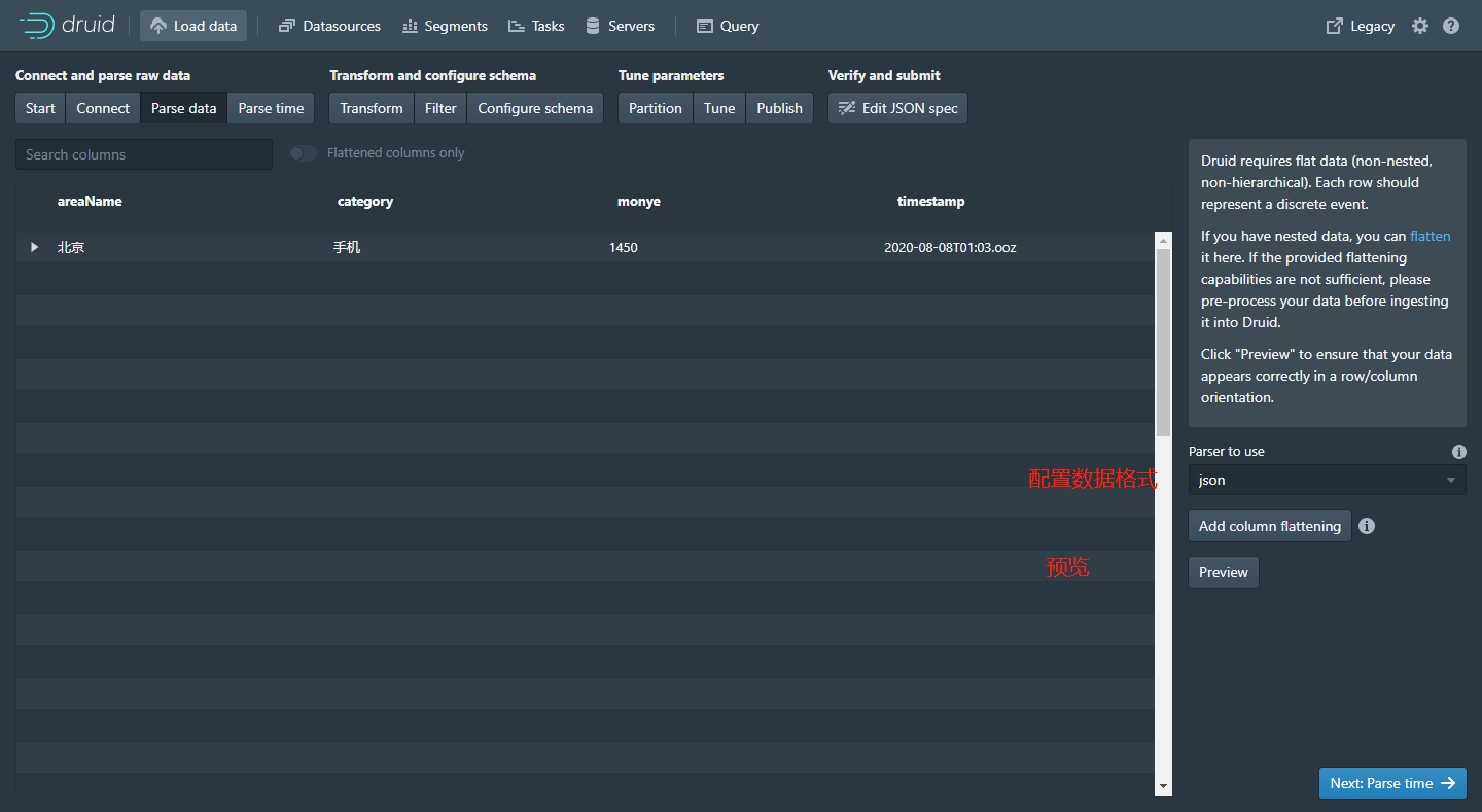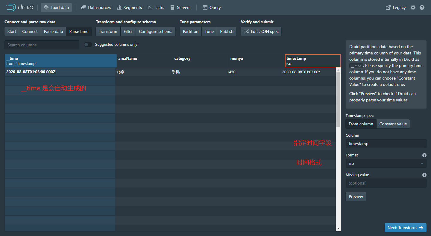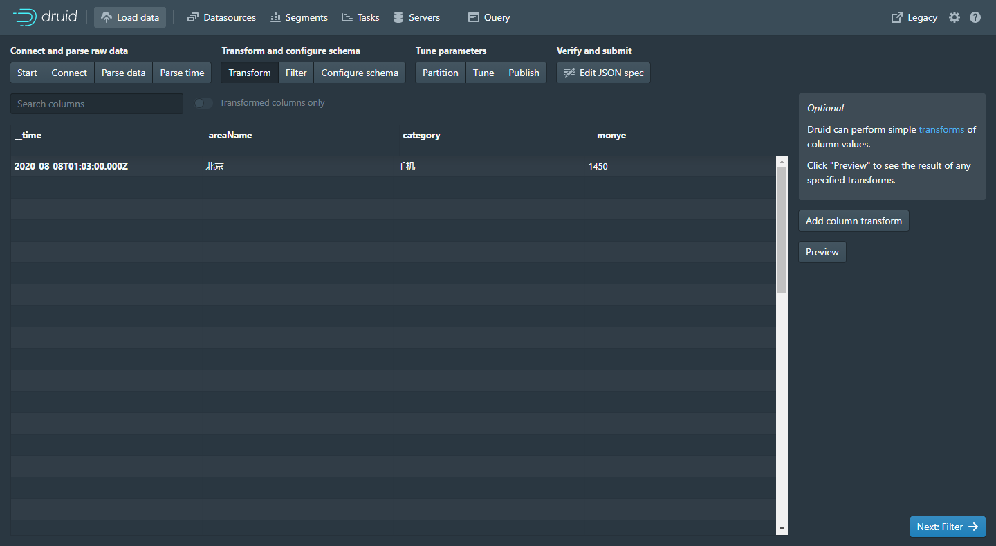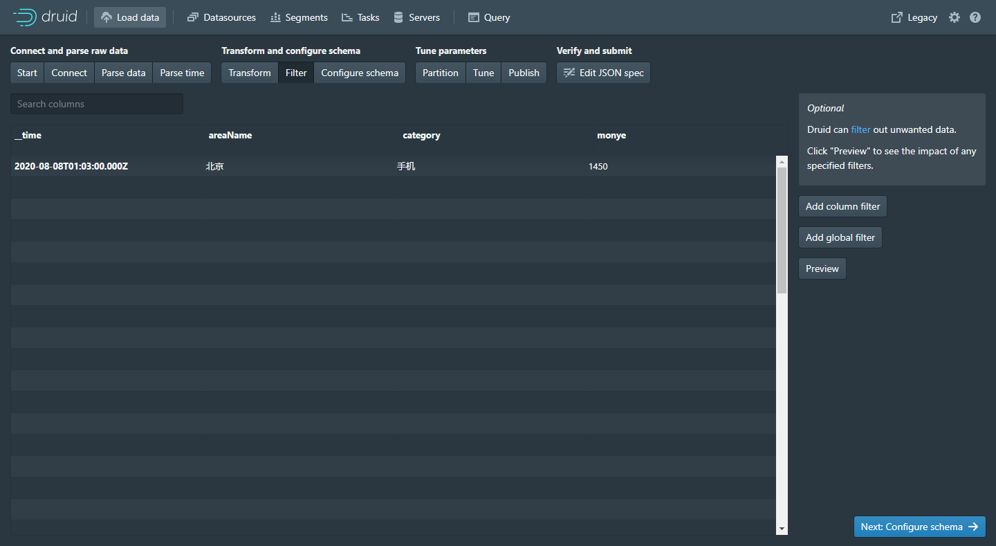 以上就是优美夕阳最近收集整理的关于Apache Druid 从Kafka加载数据 -- 全流程分析一、Kafka 创建topic、生产者二、向kafka生产数据三、Apache Druid 配置DataSource 数据源案例一:销售数据查询示例案例二:通过服务器系统时间(毫秒)作为时间戳上传案例三:通过服务器系统时间(秒)作为时间戳上传案例四:通过服务器系统时间(20210101082805)作为时间戳上传的全部内容,更多相关Apache内容请搜索靠谱客的其他文章。