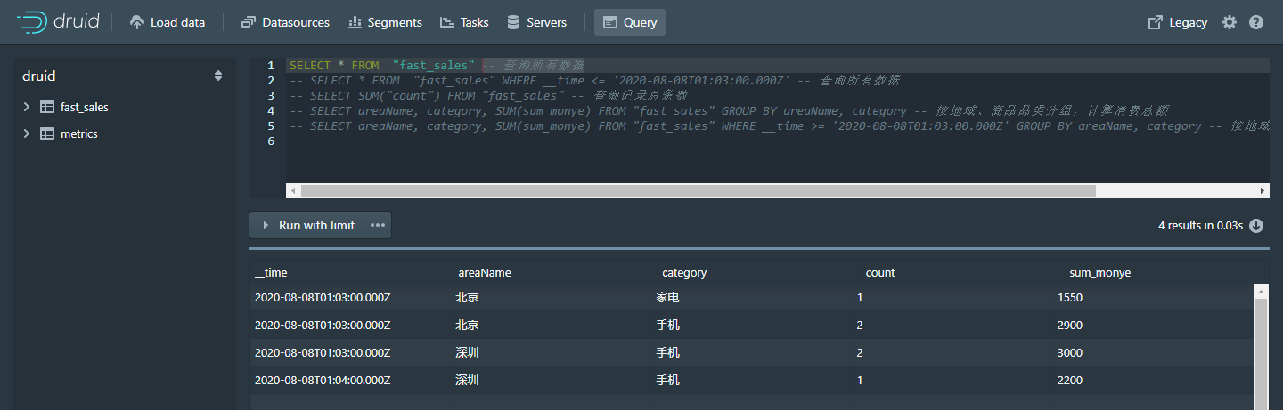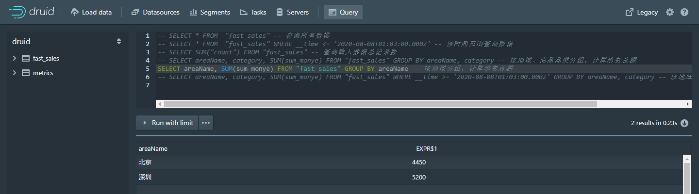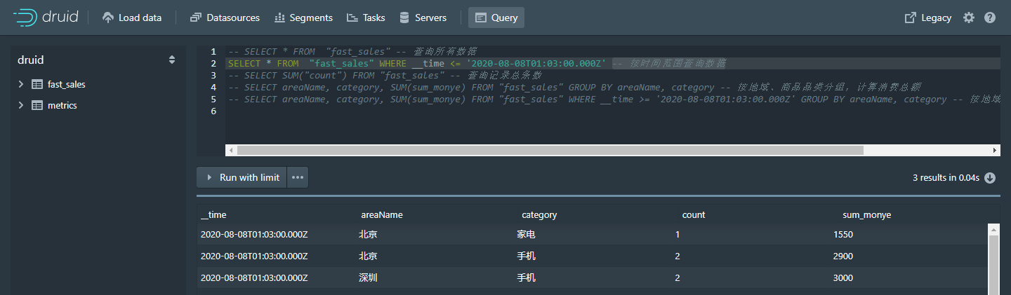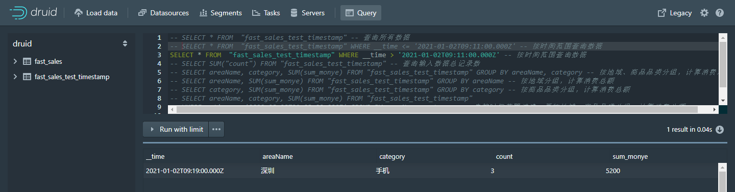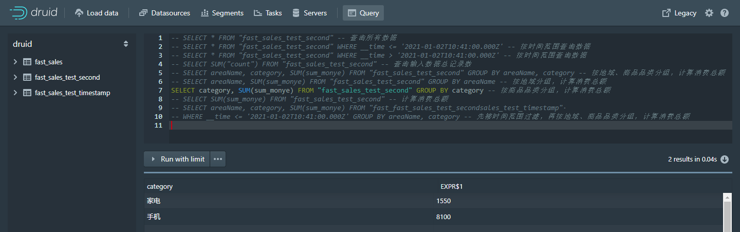 -- WHERE __time <= '2021-01-02T09:11:00.000Z' GROUP BY areaName, category -- 先搂时间范围过滤,再按地域、商品品类分组,计算消费总额