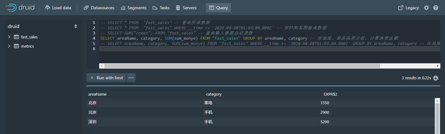 SELECT areaName, category, SUM(sum_monye) FROM "fast_sales_test_timestamp"