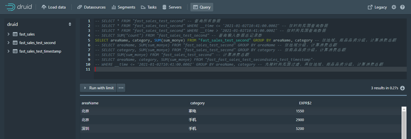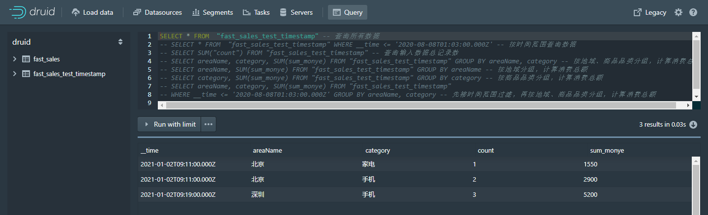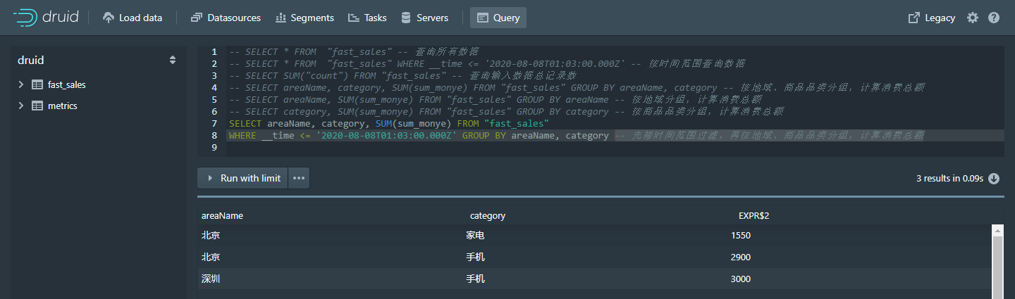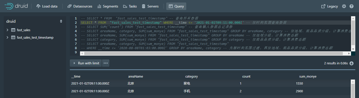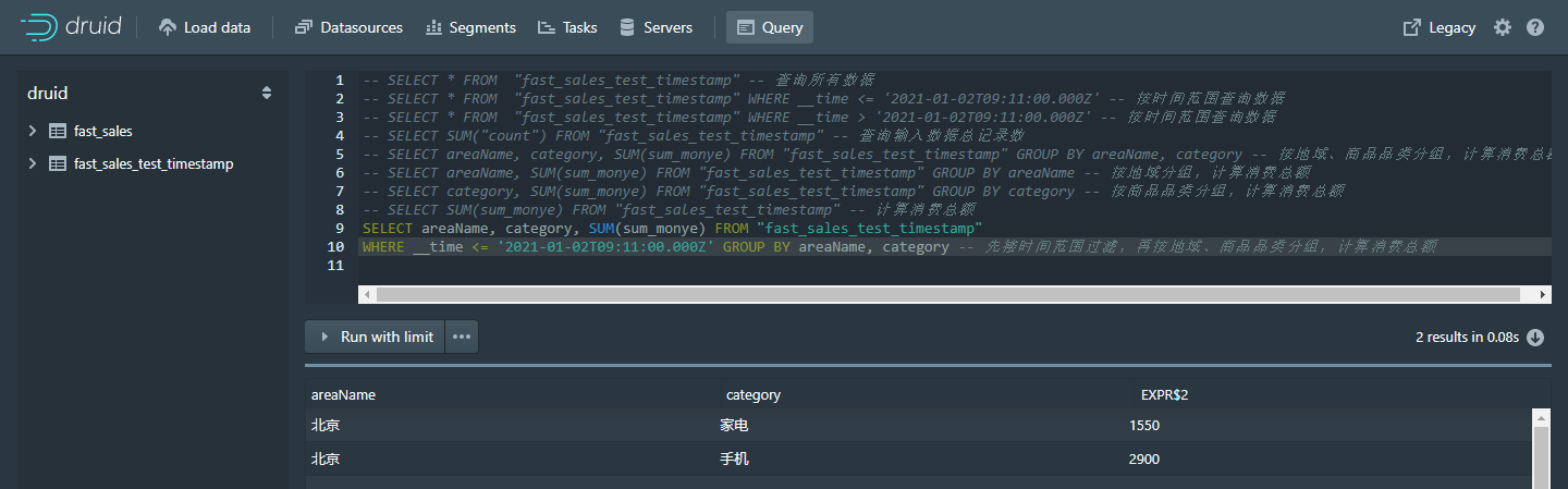 WHERE __time <= '2021-01-02T09:11:00.000Z' GROUP BY areaName, category -- 先搂时间范围过滤,再按地域、商品品类分组,计算消费总额