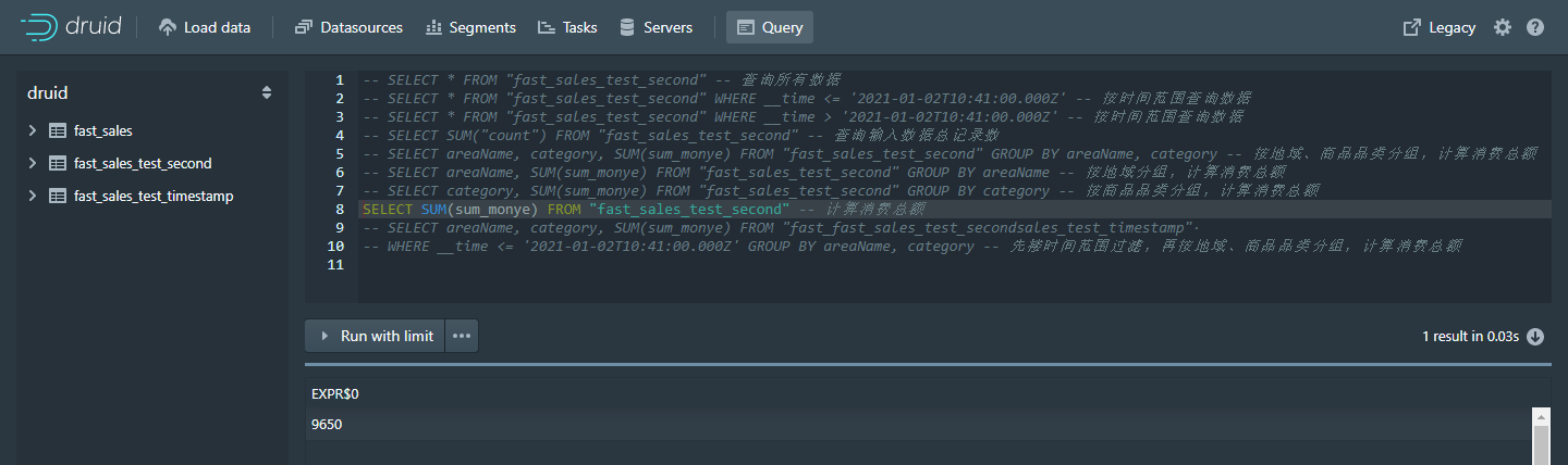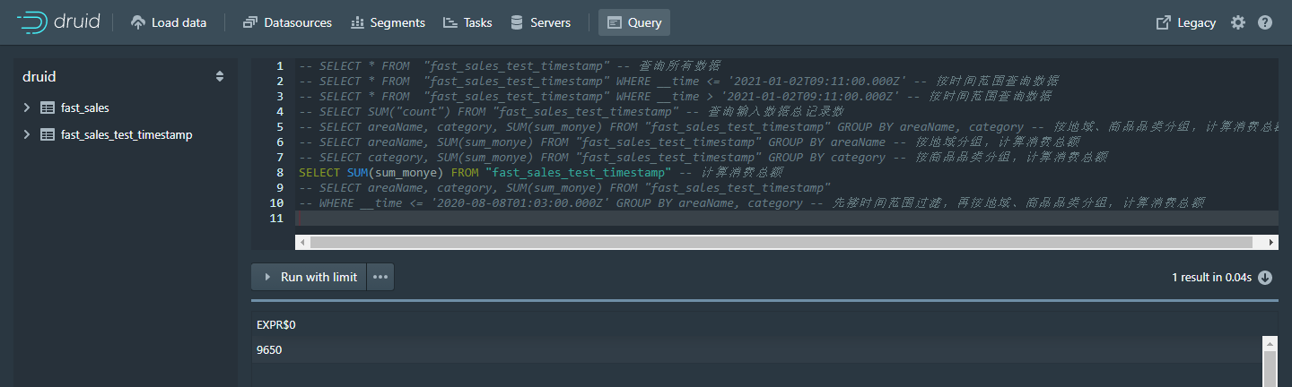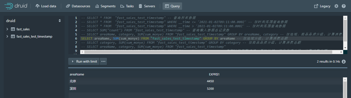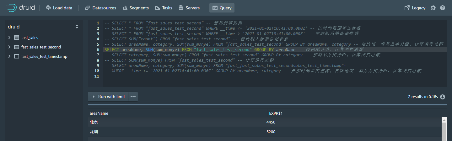 - SELECT areaName, SUM(sum_monye) FROM "fast_sales_test_timestamp" GROUP BY areaName -- 按地域分组,计算消费总额