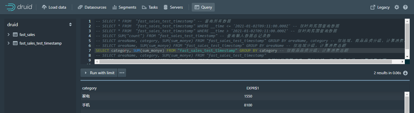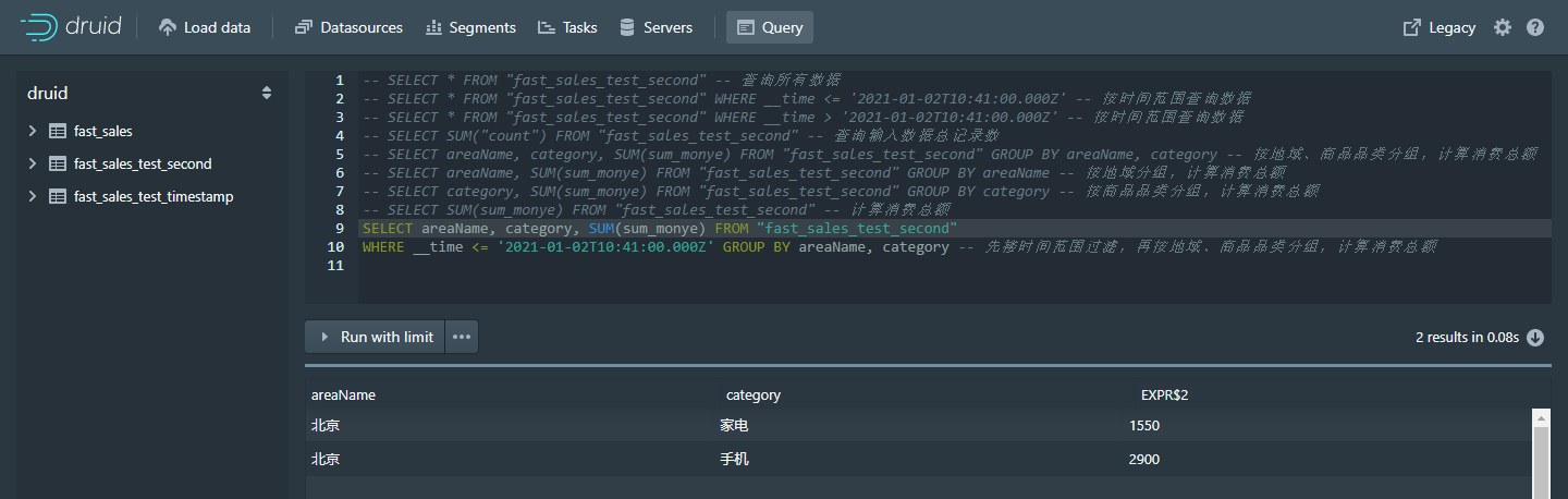 WHERE __time <= '2021-01-02T10:41:00.000Z' GROUP BY areaName, category -- 先搂时间范围过滤,再按地域、商品品类分组,计算消费总额
