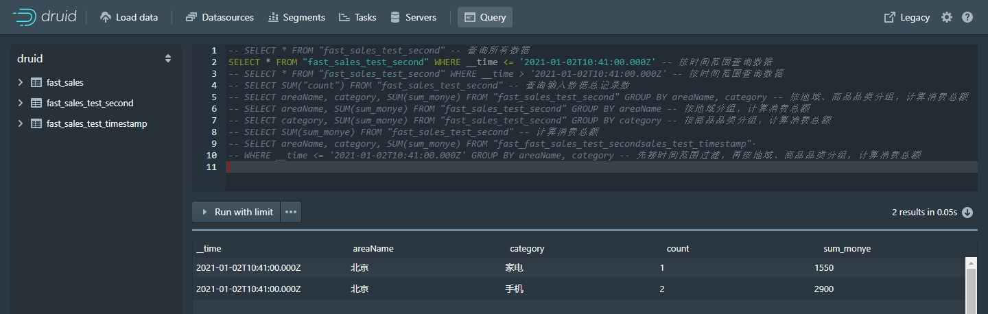 -- WHERE __time <= '2021-01-02T10:41:00.000Z' GROUP BY areaName, category -- 先搂时间范围过滤,再按地域、商品品类分组,计算消费总额