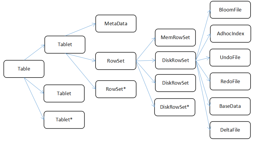 kudu表基于其partition方法被拆分成多个分区,每个分区就是一个tablet,一张kudu表所属的所有tablets均匀分布并存储在tablet servers的磁盘上。