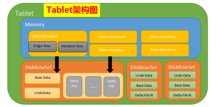 2、在内存中对每个Tablet分区维护一个MemRowSet来管理最新更新的数据,默认是1G刷新一次或者是2分钟。后Flush到磁盘上形成DiskRowSet,