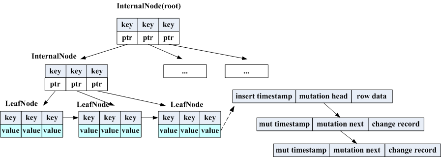 这颗B+树实现的比较简单,因为它没有update跟delete操作,kudu在MemRowSet中中数据的mutation采用类似append log方式,在base数据上有个mutation指针,所有的后续mutation操作都挂在这个指针上了。