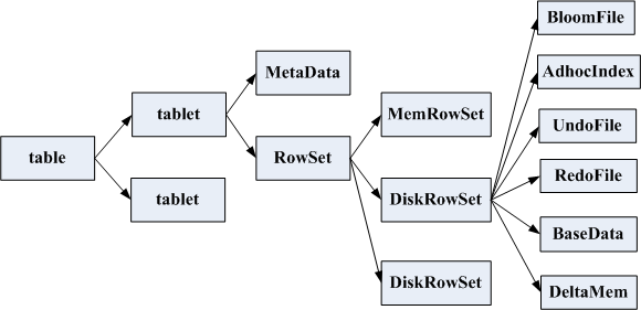 一张表会分成若干个tablet,每个tablet包括MetaData元信息及若干个RowSet,RowSet包含一个MemRowSet及若干个DiskRowSet,DiskRowSet中包含一个BloomFile、Ad_hoc Index、BaseData、DeltaMem及若干个RedoFile和UndoFile(UndoFile一般情况下只有一个)。
