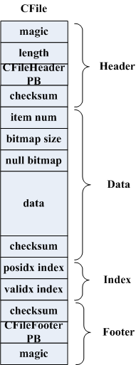 Footer是记录了CFile的元信息,包括posidx_index、validx_index两棵树根节点所在位置,数据条目、编码、压缩方式等。