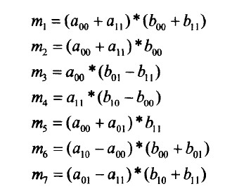 数一下,这样来计算2个二阶矩阵的乘法用了7次乘法,18次加法。而蛮力法用了8次乘法和4次加法。当然,这还不能体现出它的优越性,它的优越性表现在当矩阵的阶趋于无穷大时的渐进效率。