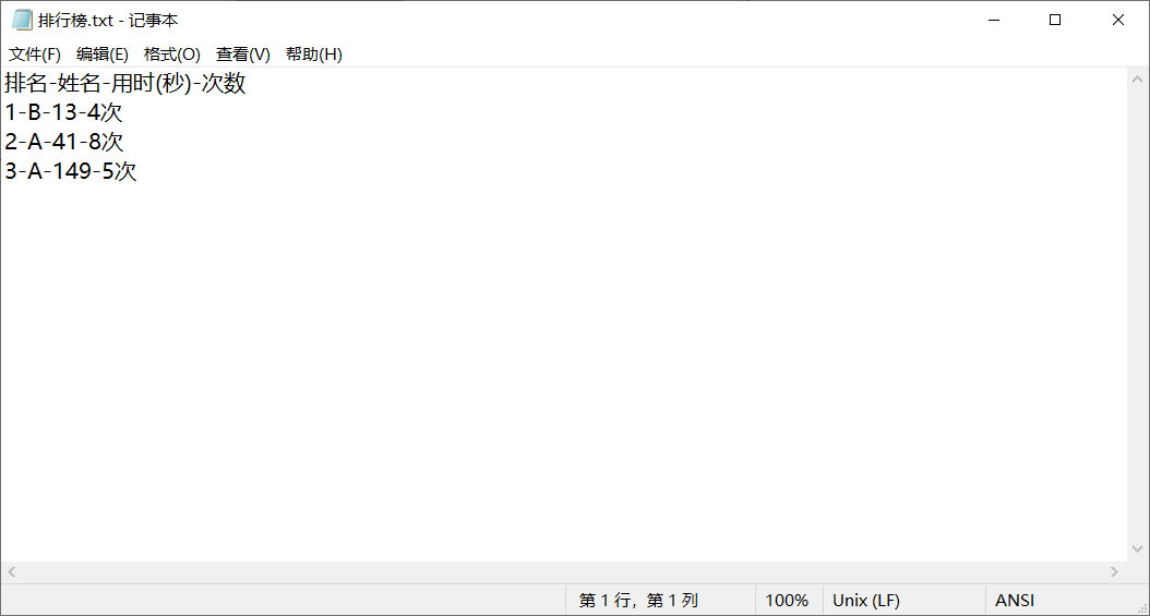 bw.write("排名-姓名-用时(秒)-次数n");