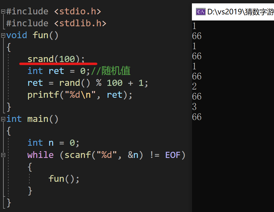 给srand函数传100,运行如下:
