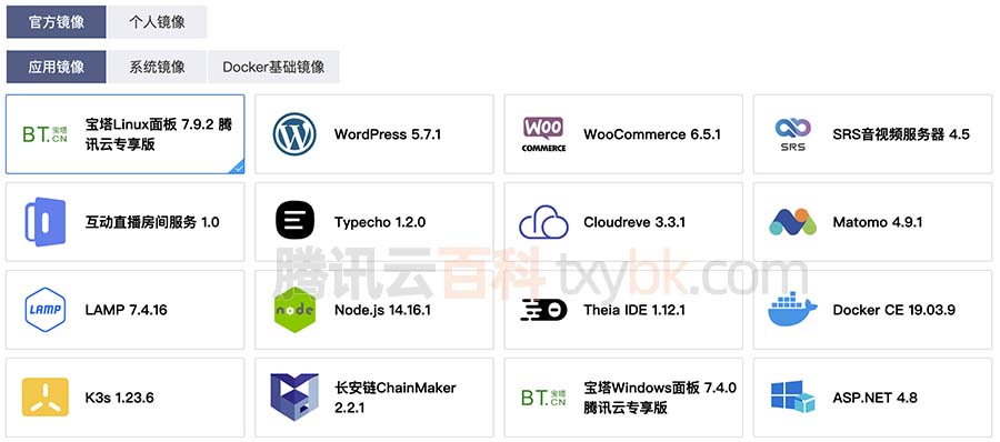 - 腾讯云轻量应用服务器内置了宝塔Linux面板、WordPress、WooCommerce、SRS音视频服务器、互动直播房间服务、Typecho、Cloudreve、Matomo、LAMP、Node.js、Theia IDE、Docker CE、K3s、长安链ChainMaker、宝塔Windows面板、ASP.NET等。